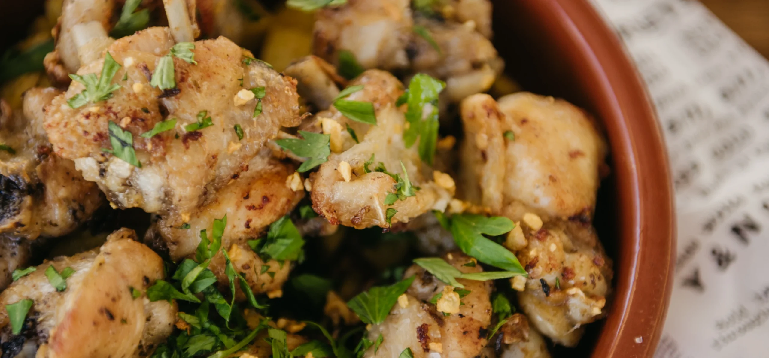 Choco al ajillo picantón con huevo frito y patatas 16€